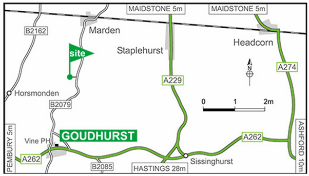 From the North (Maidstone) on the A229: in 1.25 miles fork right at the roundabout onto the A229 towards Loose, Coxheath; in 4 miles just past Stile Bridge Inn, fork right onto the B2079 to Marden; in 2.25 miles at the T-junction in Marden turn right (still on the B2079). The Site entrance is on the right within 2.5 miles (see map & streetview).