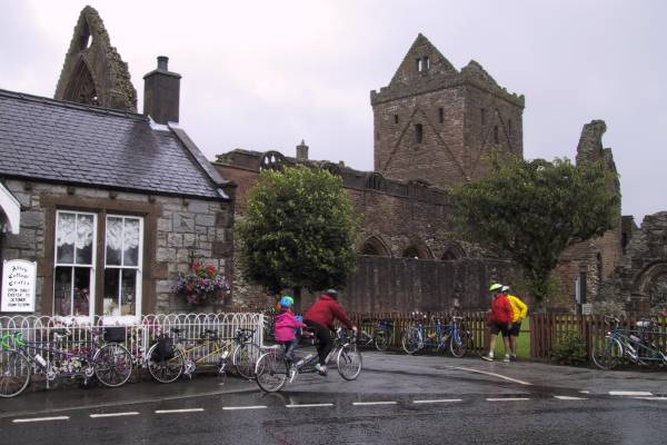 Sweetheart Abbey: The splendid remains of a late 13th/early 14th century Cistercian Abbey founded by Devorgilla, Lady of Galloway, in memory of her husband John Balliol King of Scotland and founder of Balliol College Oxford). Devorgilla is buried in the presbytery with a casket of silver and ivory containing her husband's embalmed heart. The red sandstone walls and tower are intact but the roof is gone.